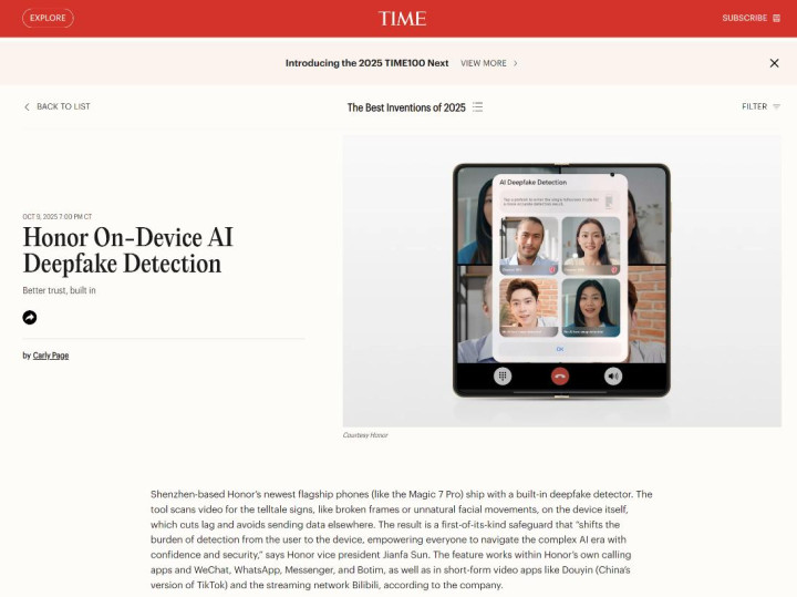 对于“端侧AI换脸检测技术”,《时代周刊》称其为AI时代安全防护的重要创新。荣耀最新旗舰手机(如 Magic7 Pro)配备AI反诈检测功能,可在端侧检测视频,查找画面不连贯、面部动作不自然等深度伪造迹象,既减少延迟,又避免数据外发。“这一首创防护措施,帮助用户利用手中的设备识别风险,使人们在复杂AI时代更有信心且安全地生活。”荣耀MagicOS总裁孙建发表示。